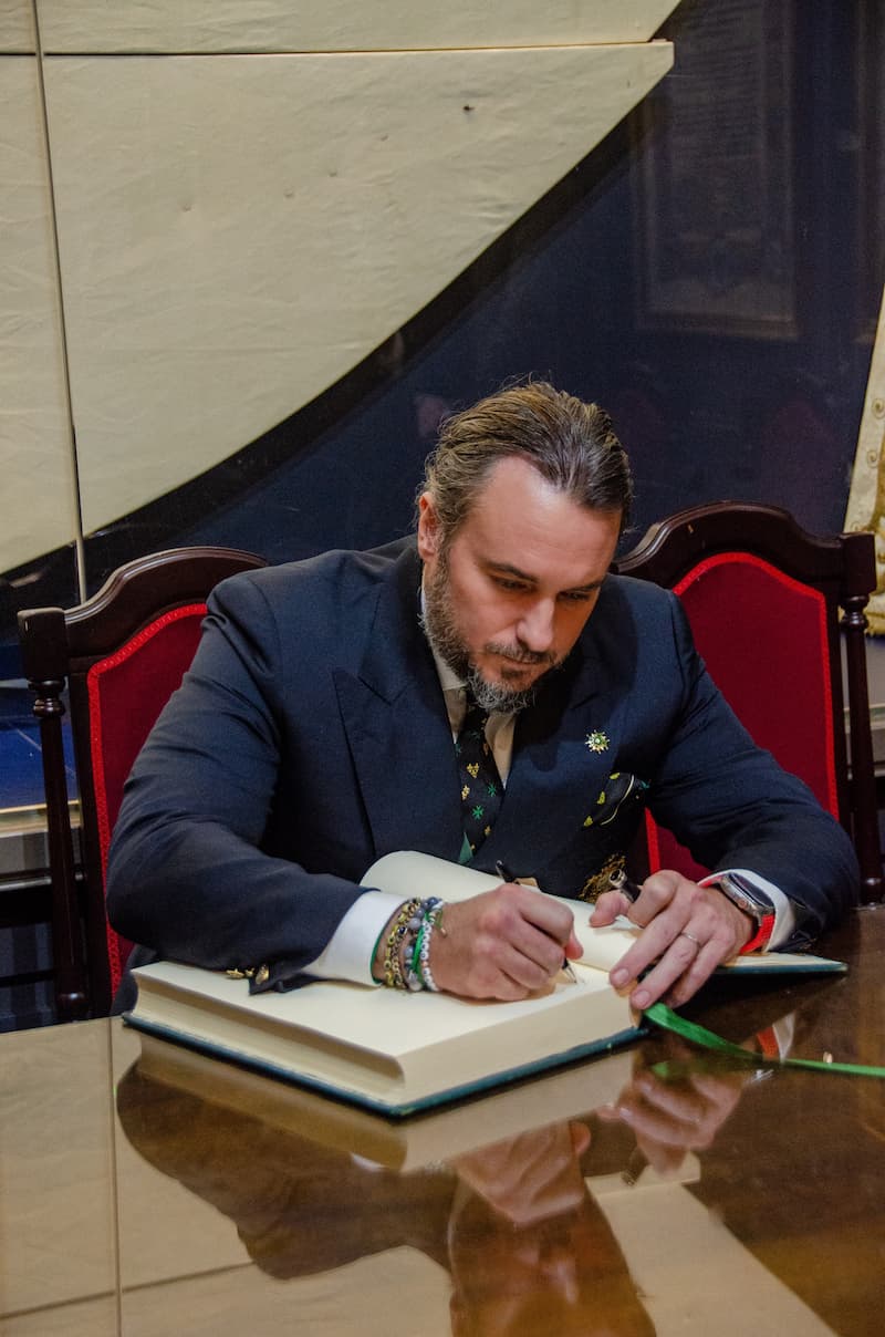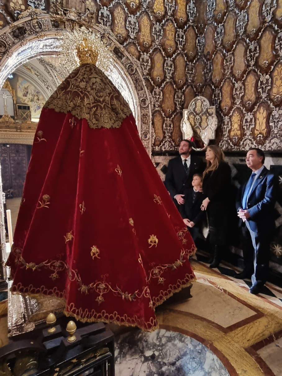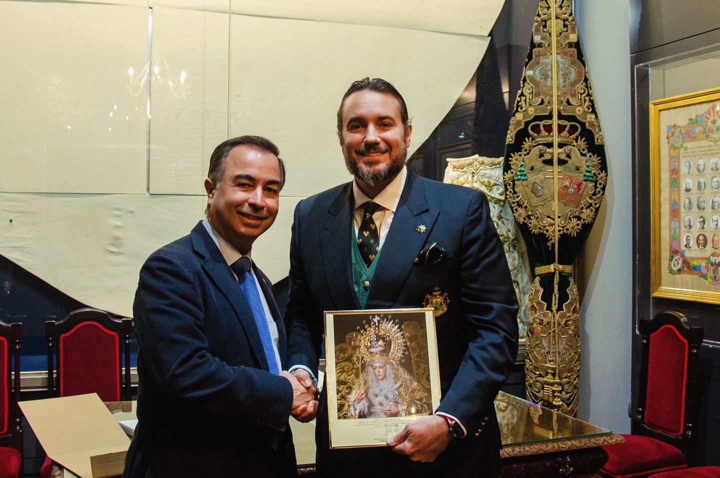 At the heart of the brotherhood is the veneration of Nuestra Señora de la Esperanza Macarena, one of the most revered religious images in the country, whom we had the privilege of seeing up close during a special visit. We were warmly welcomed by Don Fernando Fernández Cabezuelo, President; José Luis Vega Vázquez, Vice President; Manuel Campbell Caro, First Counselor for Charity and Social Assistance; José Javier de Tarno Sánchez, Secretary of Our Lady of Hope; Antonio José Carrasco Torres, Steward of Our Lady of Hope; and Don Rafael Álvarez y Álvarez.